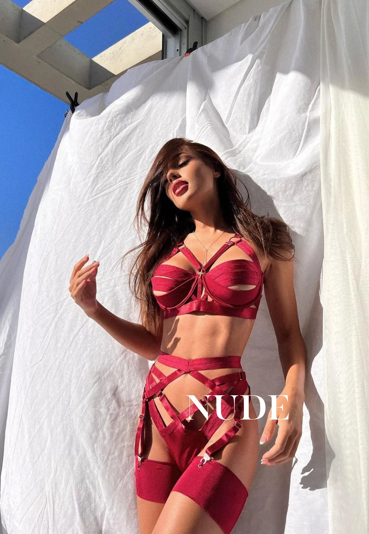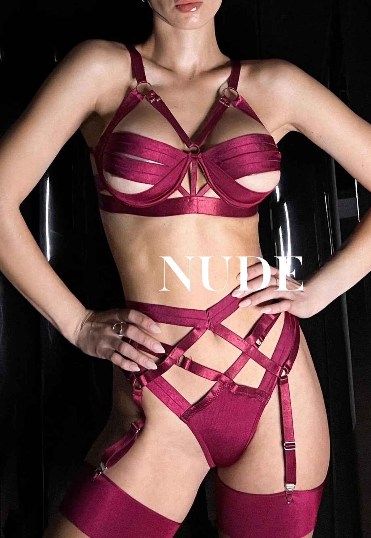 Set lencero de 5 piezas en color tinto. Bra fabricado en tiras elásticas, al igual que la tanga, incluye su liguero y 1 par de ligas gruesas.