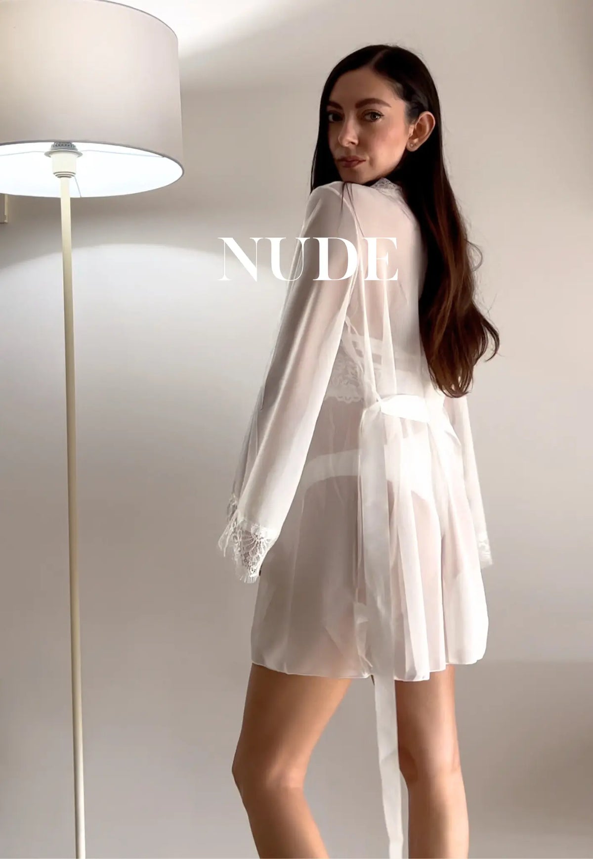 Bata corta en tela stretch traslúcida color blanco con bordados florales en mangas y pecho.