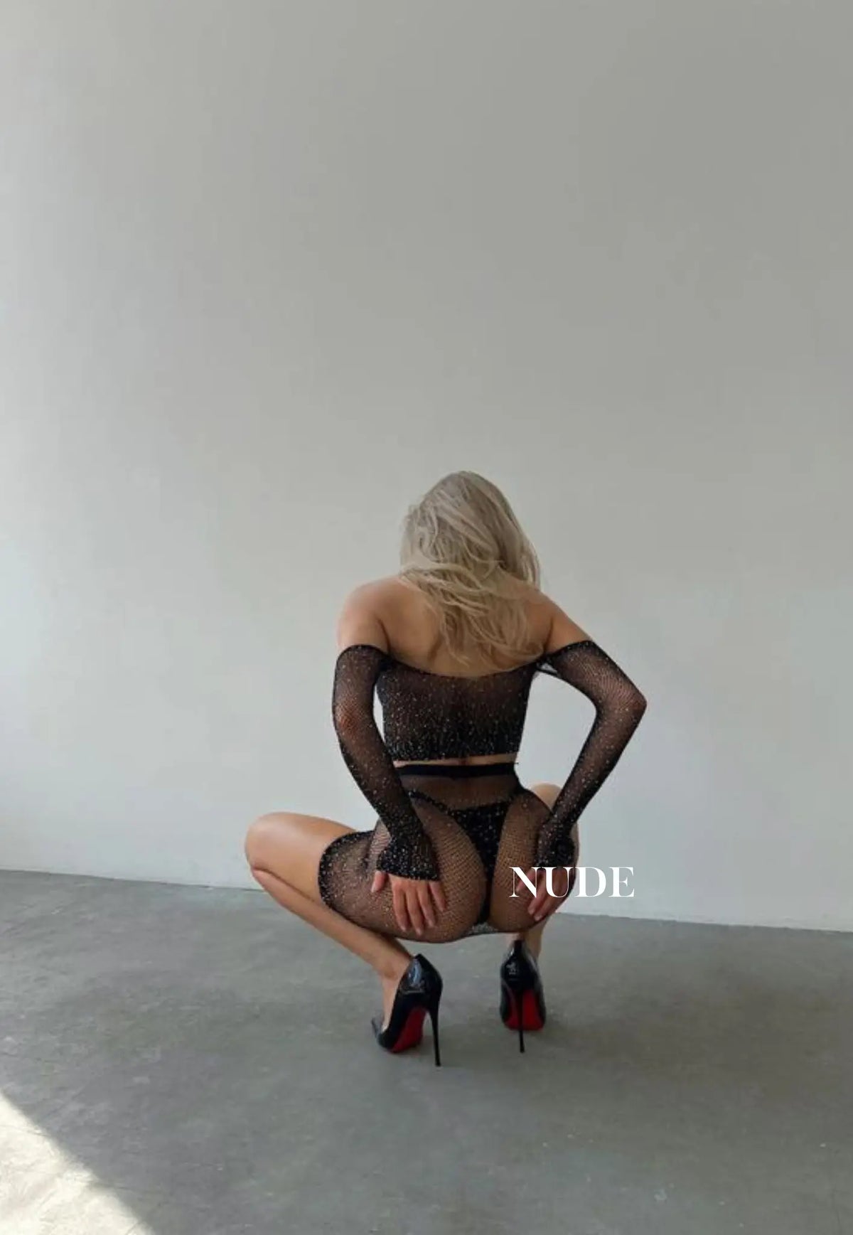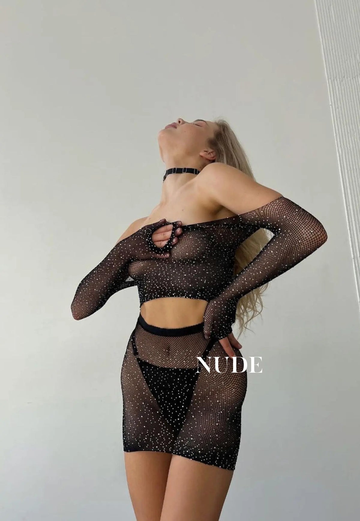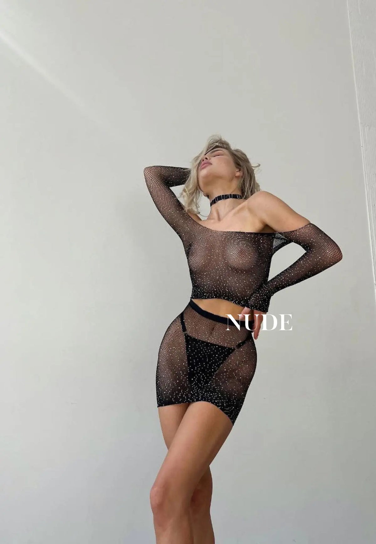 Conjunto de 2 piezas: top de manga larga y mini falda, fabricado en tela de red con pedrería tipo brillos.