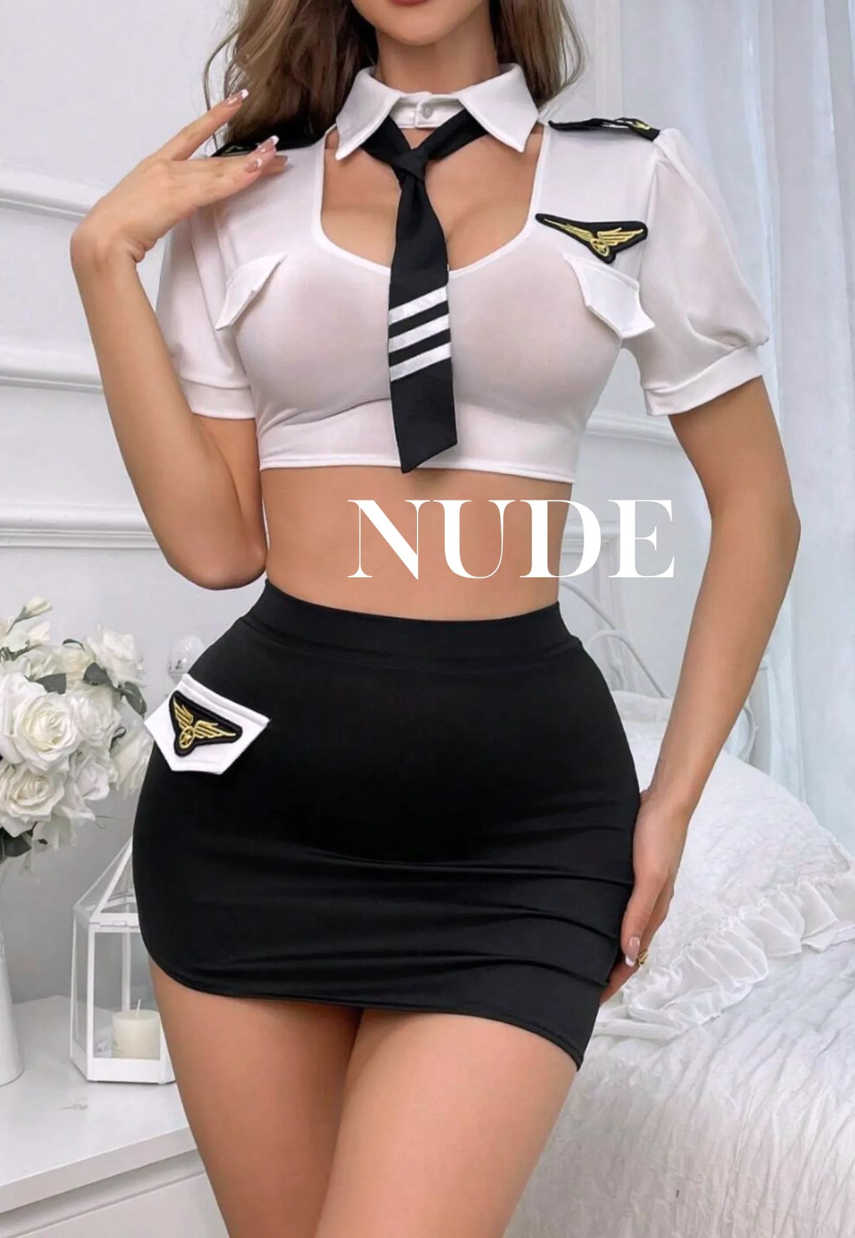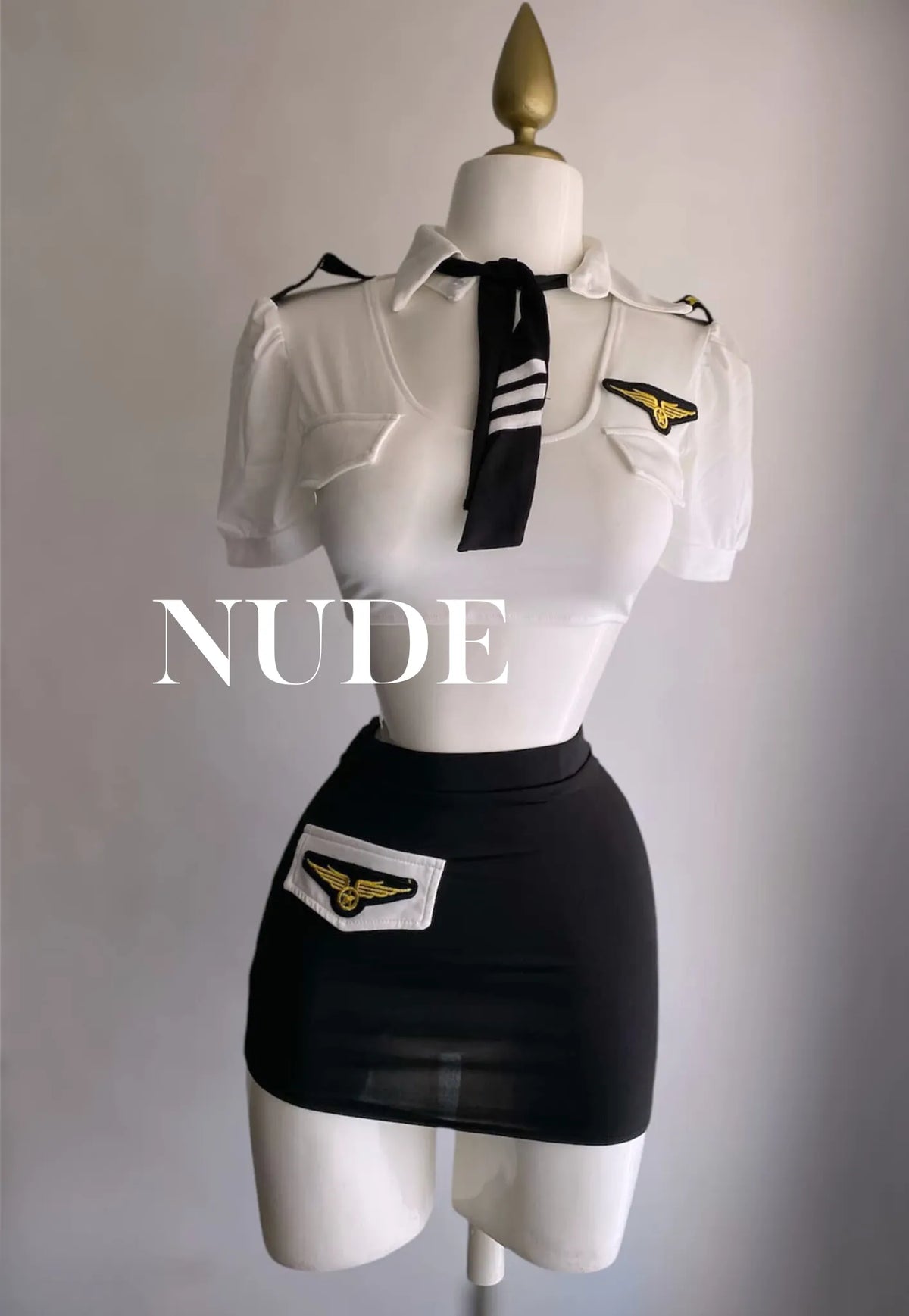 Blusa croptop blanca super stretch con aplicaciones aéreas, cuello formal, corbata negra y falda asimétrica negra tipo azafata.