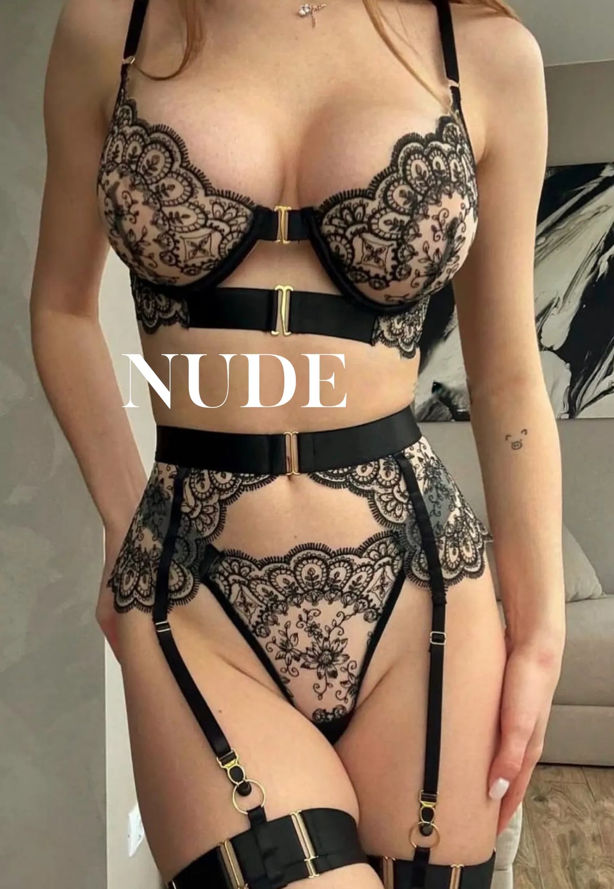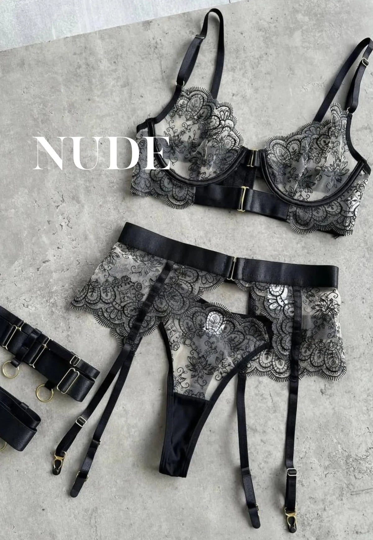 Set lencero de 5 piezas en tela traslúcida mesh con bordados florales negros. Bra con varilla. Liguero en cintura de encaje, tanga y 1 par de ligas para piernas.