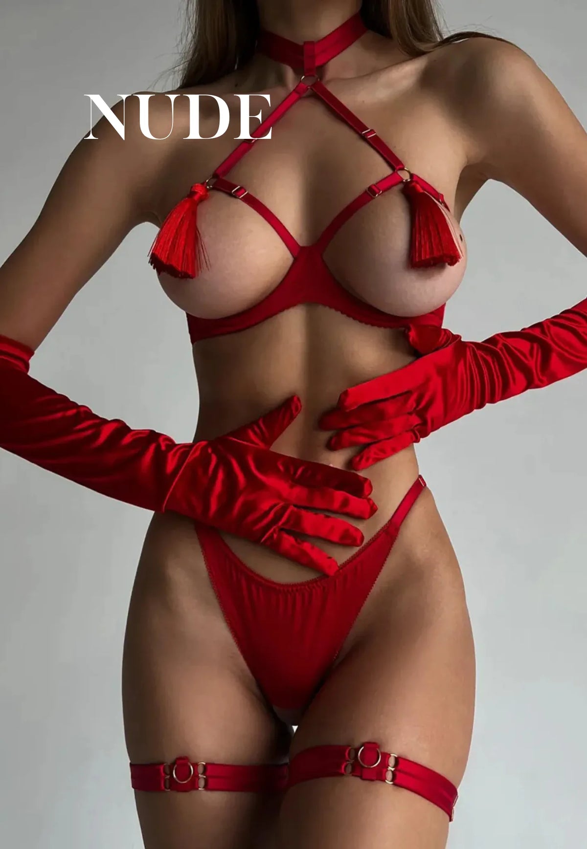 Lenceria de 4 piezas: Bra ajustable de copa abierta, pantie ajustable y 2 ligas para piernas. (Este modelo no incluye guantes)