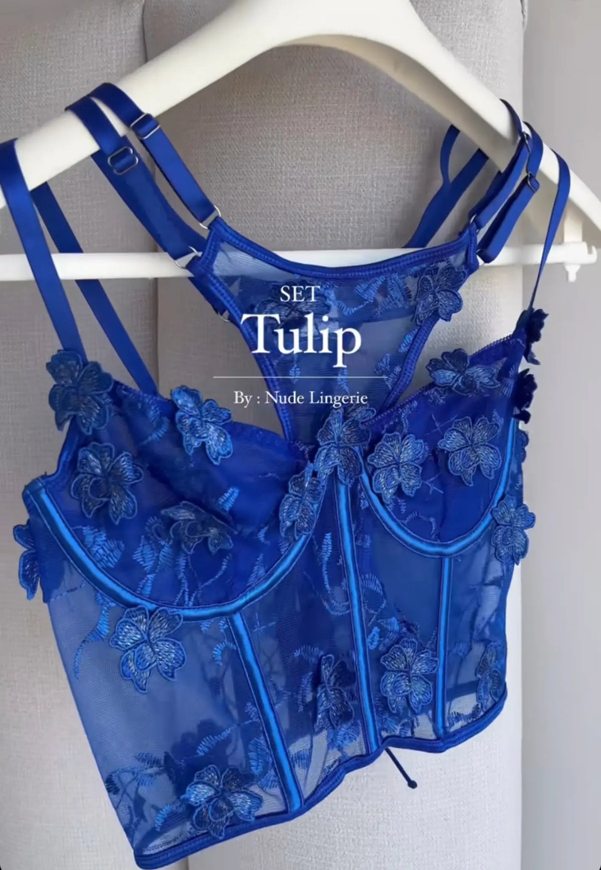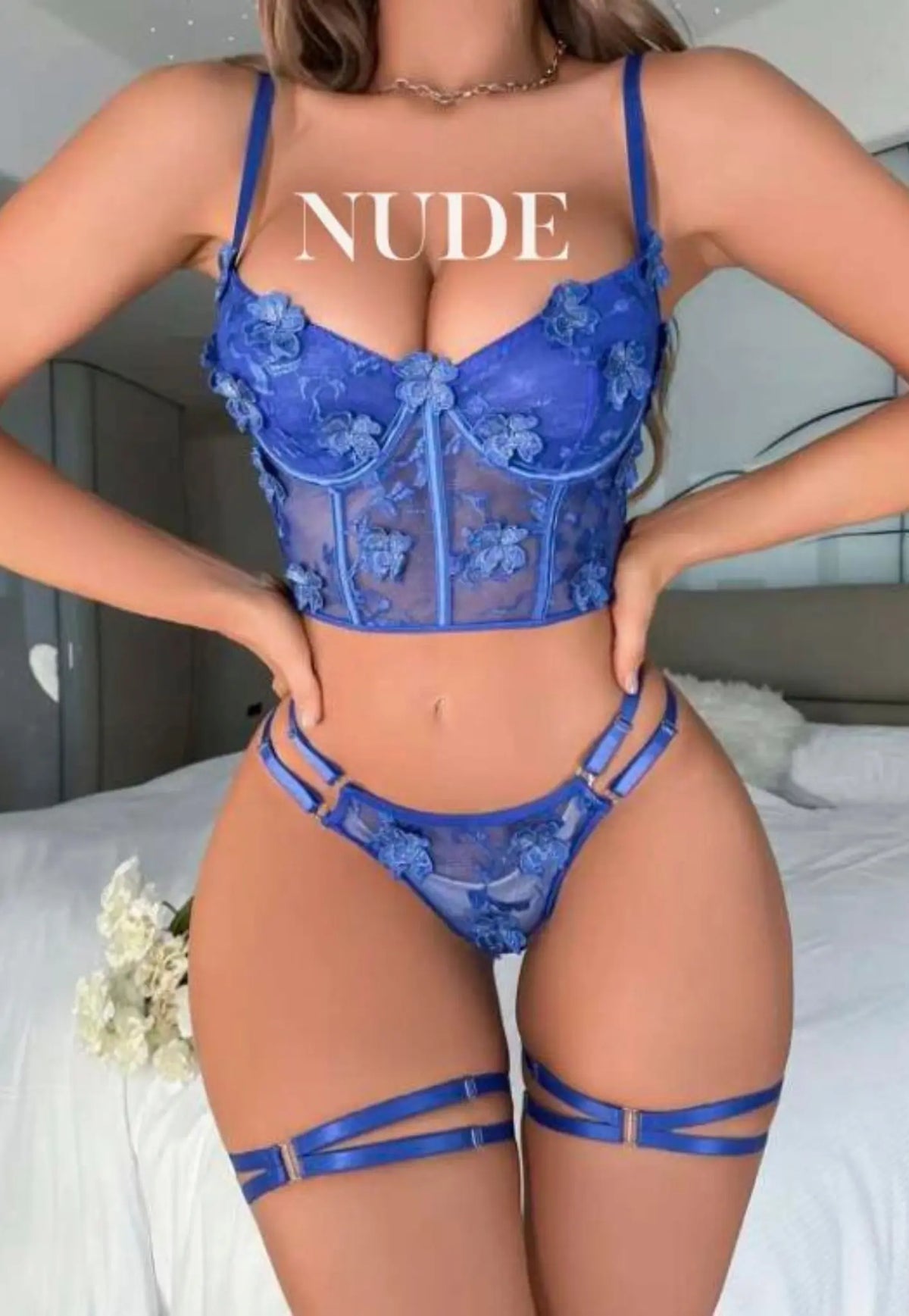Set lencero de 4 piezas: bustier ligeramente traslucido con aplicaciones de flores 3D y varillas, detras cierre de corset. Tanga de doble tira en cadera y 1 par de ligas.