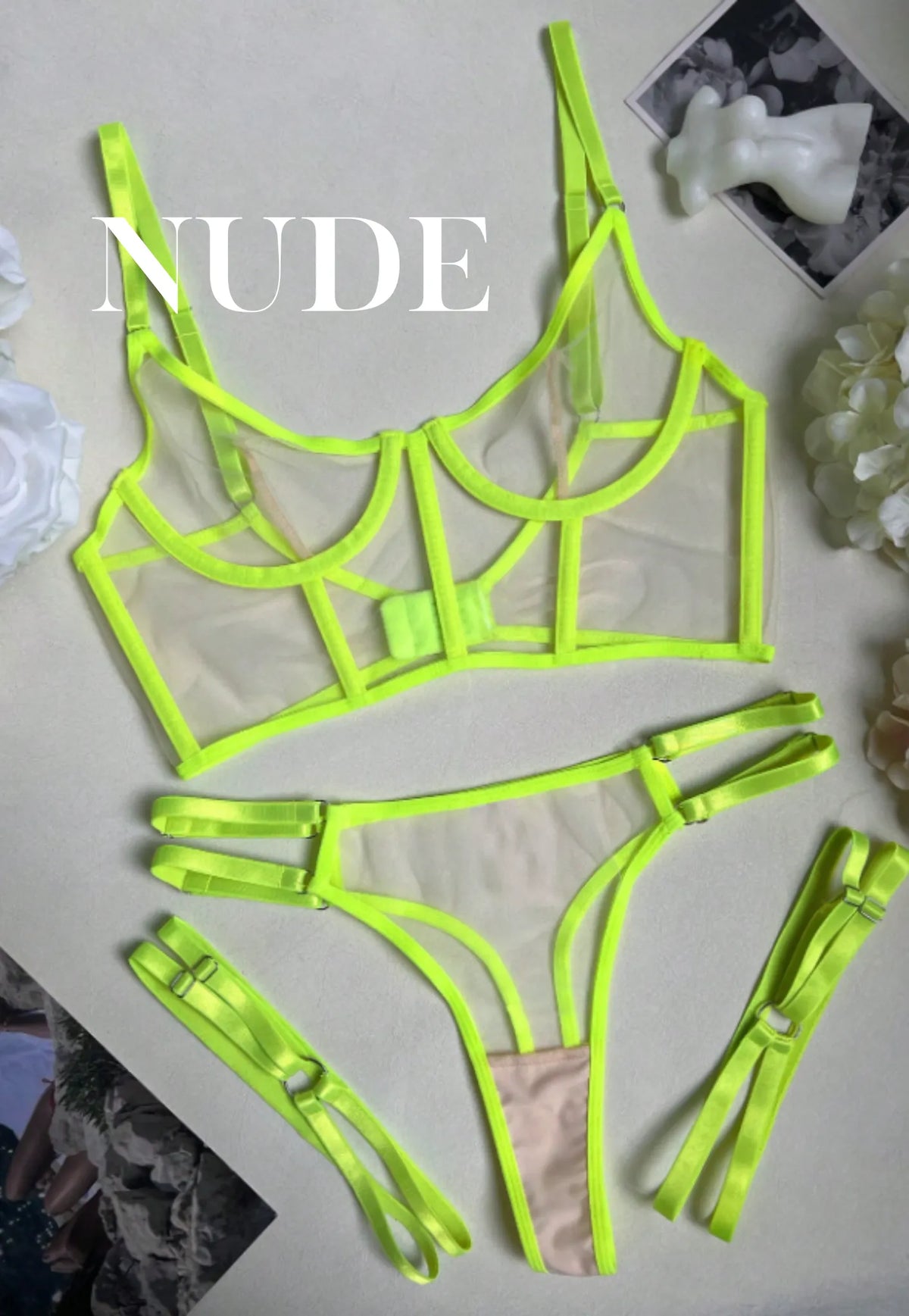 Set lencero de 4 piezas en tela traslúcida mesh con detalles en neon. Top con varilla.  Tanga y 1 par de ligas para piernas.