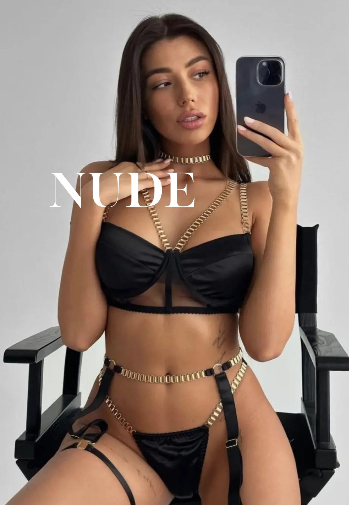 Set de 2 piezas: top con varillas en tela satinada y traslúcida. Cadenas en color dorado. Pantie de tipo tanga. Incluye liguero