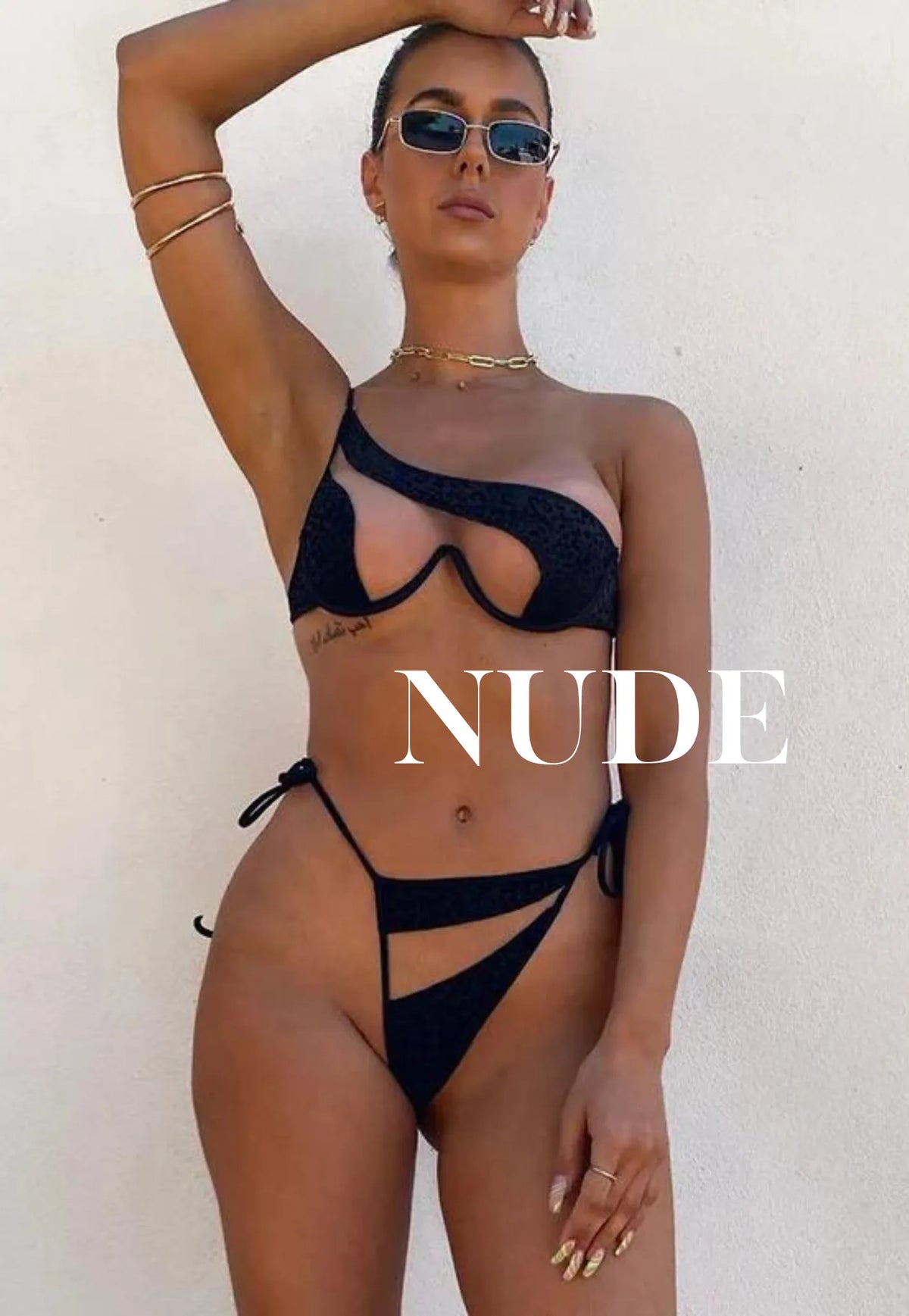 Bikini de 2 piezas asimétrico con tela mesh en top y bikini formando cutouts.