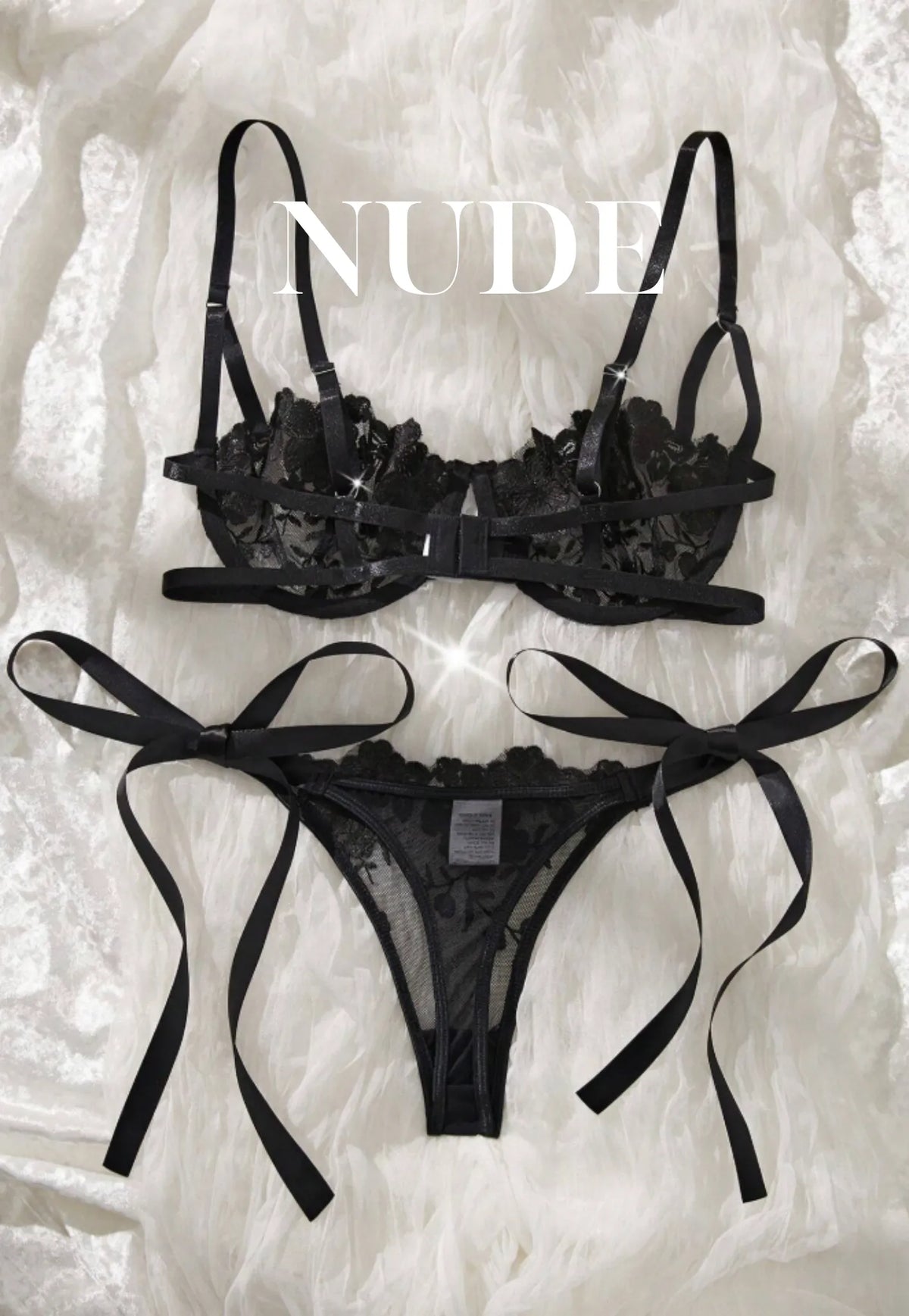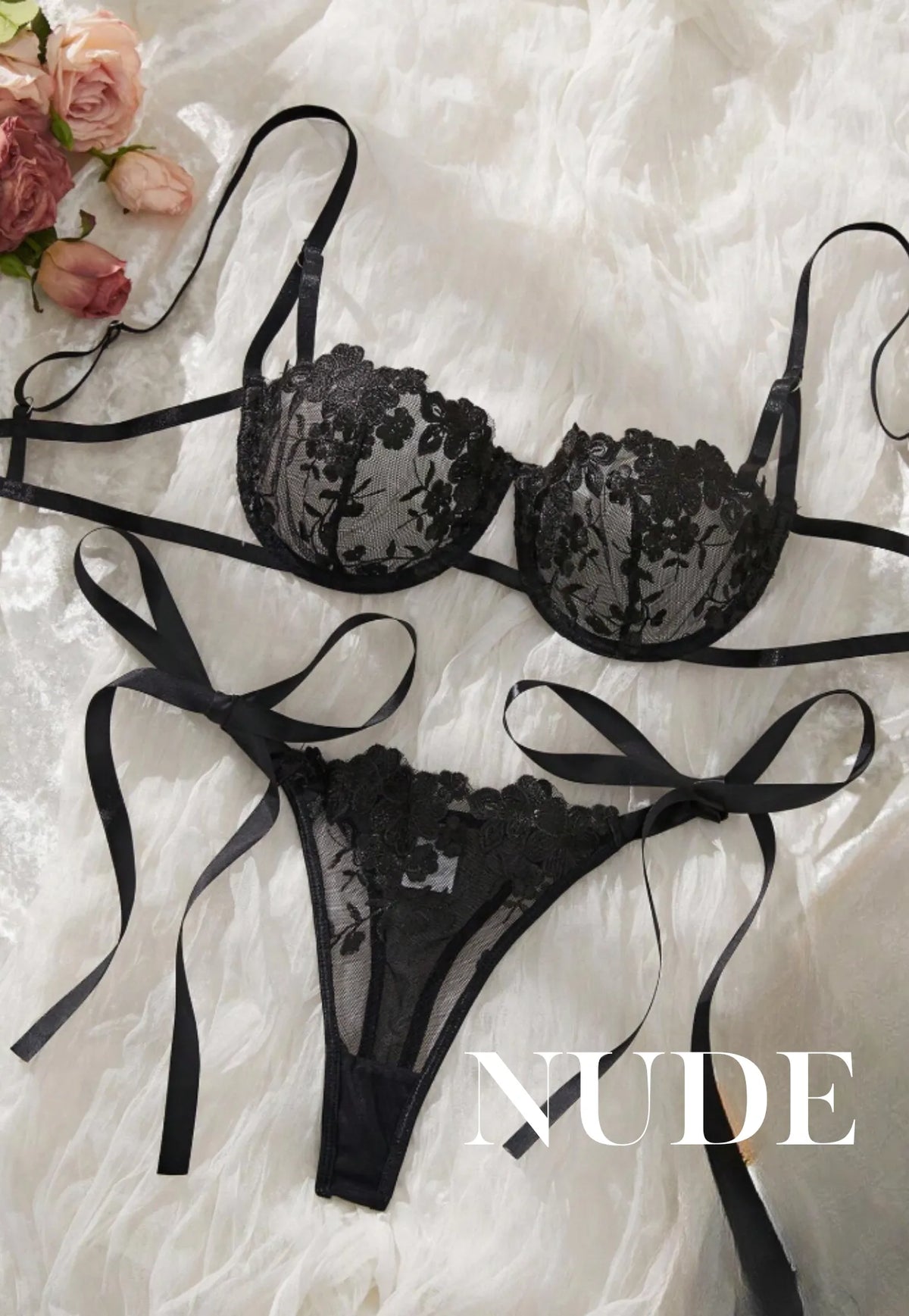 Set de encaje floral, bra con varillas y tanga con amarre de listón.